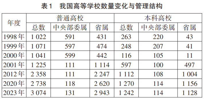 同一时期,即自1999年开始,我国高等教育开始大规模扩大招生,高等学校的数量和高校学生数迅速增加。高等教育的结构随之发生了历史性变化。2000年全国普通高校总数1041所,其中中央部门所属高校599所,省属高校442所,而到2001年,高校总数1225所,其中中央部门所属高校只有111所,省属高校猛增为1114所,成为真正的多数。(见表1)“两级管理、以省为主”的管理格局成为不可逆转的态势。管理体制改革为地方高校的发展创造了有利的制度环境。一方面,管理权下放增强了地方政府发展高等教育的责任感和主动性;另一方面,市场竞争机制的引入促使高校更加注重办学质量和特色发展;同时社会力量办学迅猛发展,民办高校迅速发展。然而,由于区域经济发展不平衡,地方高校在资源获取、人才吸引等方面面临严峻挑战,省域高等教育治理能力和发展水平的不平衡性相当显著。