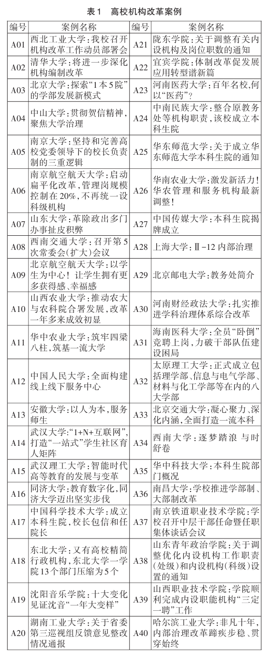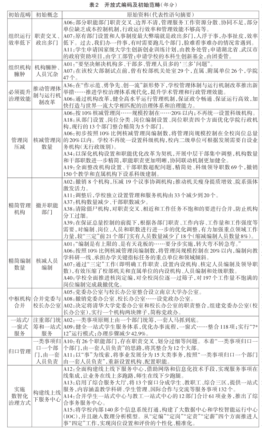 机构是维系高校组织运转的基本构件,是高校内部治理体系的重要支撑。为构建系统完备、科学规范和运行高效的职能体系,必须根据时代变迁和社会发展形势进行机构改革,应对组织机构发展过程中产生的各种沉疴顽疾。党的二十届二中全会审议通过的《党和国家机构改革方案》,是我国改革开放以来启动的第九轮机构改革,相比以往的改革举措力度更大、涉及面更广。高校作为国家事业单位的组成部分,同样需要优化机构设置和职能配备,提高治理效能。高校机构改革是高等教育综合改革的重要领域,应当以教育治理现代化为出发点,围绕系统完备、分工明确、运转高效的职能体系建设要求,积极开展实践探索。近些年来,伴随着高等教育的规模扩张,高校行政管理机构及管理人员也呈现快速增长的趋势,多数高校的行政机构数量保持在40-50个左右,涉及党群机构、行政组织机构及直属单位,内设机构迅速膨胀,层次繁多,出现党政领导多、管理机构多、管理人员多的现象,被形容为“校级干部一走廊,处级干部一礼堂,科级干部一操场”。高校组织机构设置普遍存在结构臃肿,职责交叉及行政官僚化倾向,进而超出学校运行的现实需求,导致人浮于事和效率低下等问题。为深度解释高校机构改革的深层次诱因,探索组织机构优化调整的实施路径,本研究采用基于扎根理论的典型案例分析法,对近期40所高校开展组织机构改革的案例进行分析,提炼出整体性的解释模型,提供可观照、可操作的具体举措。
