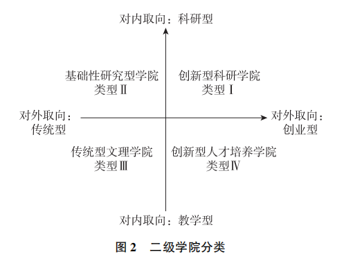 在分类治理的宏观背景下,由于各二级学院在功能目标、组织架构以及群体规模等方面存在显著差异,因此,明确二级学院的不同类型有助于全面分析学院治理模式。目前,学界针对二级学院的分类研究较少,较为常见的是根据高校内外部功能定位对高校进行分类。