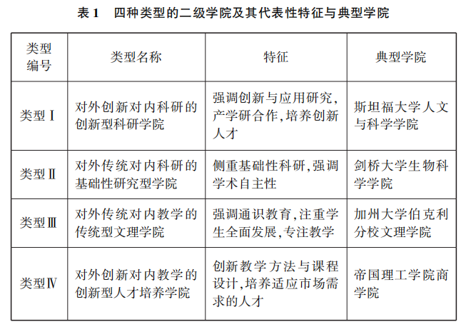 从高校外部功能定位来看,可将学院分为创业型和传统型。创业型学院则起源于对学术机构在社会经济发展中作用的重新认识,如伯顿·克拉克(Burton R.Clark)强调创新、适应性和市场导向是创业型学术机构的主要特征,以满足市场所需的知识、技能和素质要求。因此,创业型的学院定位鼓励学院在教育、研究和服务方面采取更加灵活和创新的方法,以响应知识经济和社会需求的变化;传统型学院深植于历史悠久的教育理念之中,其中以威廉·冯·洪堡(Wilhelm von Humboldt)的学术自由和“研究与教学统一” 的理念为代表,强调学科深度和系统性知识的探究,大学应保持独立性,以维护学术的纯粹性。这种定位下,学院侧重于维护和传承学术传统,倾向于采用固定的课程设置和教学方法,强调高等教育中能力培养和经典学科发展的重要性;从高校内部功能定位上看,学院可分为研究型和教学型两种主要类型。卡内基高等教育机构分类系统(Carnegie Classification of Institutions of Higher Education)采用了学位授予层次和科研强度作为分类标准,正反映了学术机构在教学与科研方面的不同侧重。