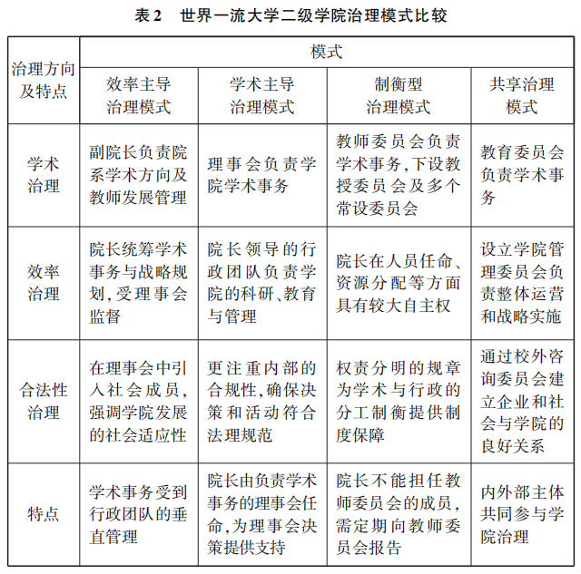 (二)世界一流大学二级学院治理模式的差异性
